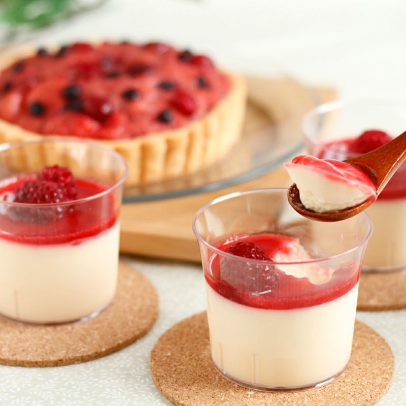 ミックスベリータルトはストロベリー・クランベリー・ブルーベリーを使用し、ホールタイプのタルトにしました。木苺プリンはとろける食感のプリンに木苺とソースをあしらいました。