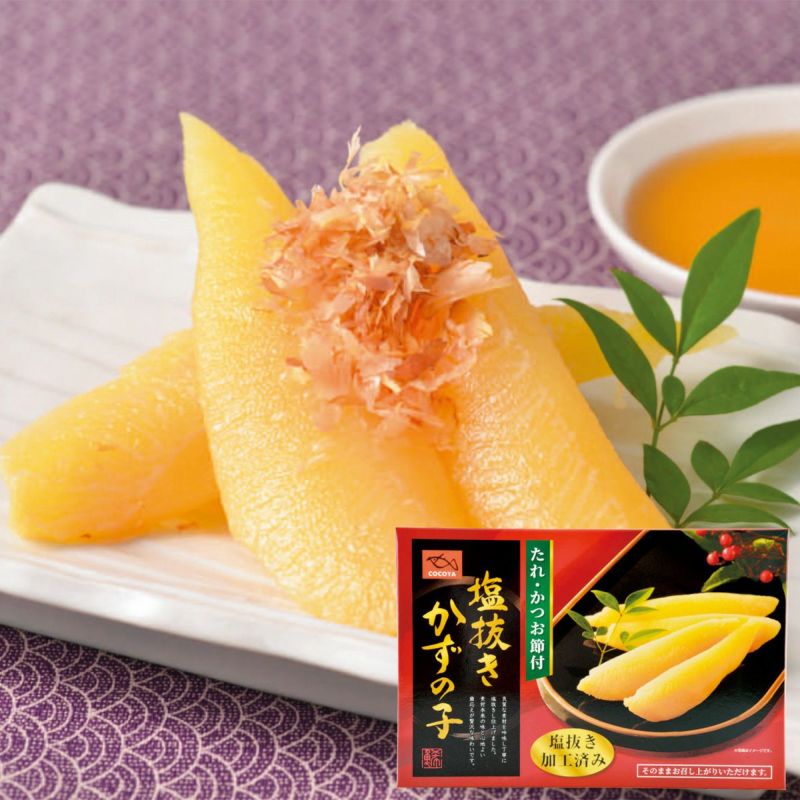 ご家庭での手間が省ける塩抜きかずの子。かつお節とたれでお楽しみください。