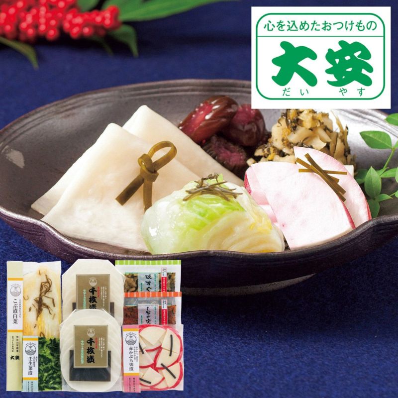 京都の代表的な漬物「大安」の千枚漬を中心に旬の野菜を取り揃えました。大安は、明治35年創業の京つけもの専門店です。漬け込む野菜は全国各地の契約農家や市場から吟味して仕入れた、国産野菜だけを使用し、素材本来の風味を生かしたこだわりの味づくりをしています。