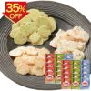 わかめ、わさび、胡麻味のえびせんを3種類詰めあわせました。北海道産じゃがいもと九州産さつまいもから作った澱粉を使用。パリパリと軽い食感をお楽しみ頂けます。